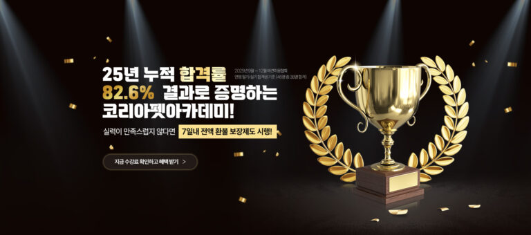 코리아펫아카데미는 25년 총 누적 합격률을 82.6%까지 달성했습니다. 결과로 증명하는 코리아펫아카데미, 추가로 코리아펫아카데미에서는 수업이 만족스럽지 않다면 7일내 묻지도 따지지도 않고 전액 환불하는 제도를 시행했습니다.